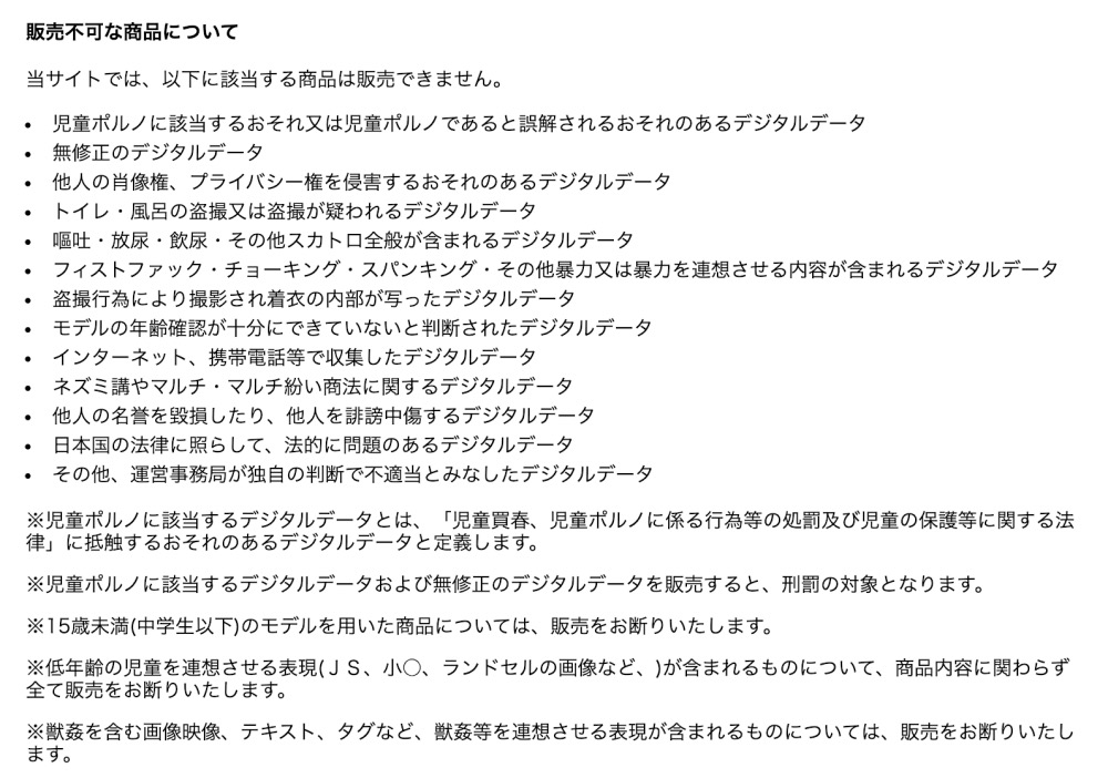 これは販売禁止のコンテンツのルールですが、これ以外にも出品者・購入者・アフィリエイト利用者それぞれで規約があり、マーケットが違法な場所とならないようになってます。